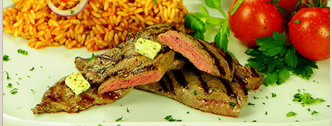 | 25 | Schweinesteaks mit Kräuterbutter Saftig gegrillte Schweinesteaks (ca. 200 gr.) mit Kräuterbutter, dazu Tomatenreis und frischer Salat |