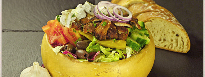 | 05 | Gyrossalat Mit Gyrosfleisch, Kraut, Eisbergsalat, Tomaten, Gurgen, oliven, Pepperonis,Fetakäse, Zwiebeln, Balsamicoessig und Olivenöl. |