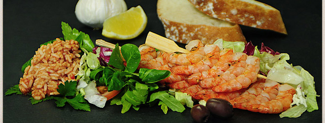 Mit gegrillten Scampis, in einer Tomaten- Knoblauchsoße und frischer Petersilie